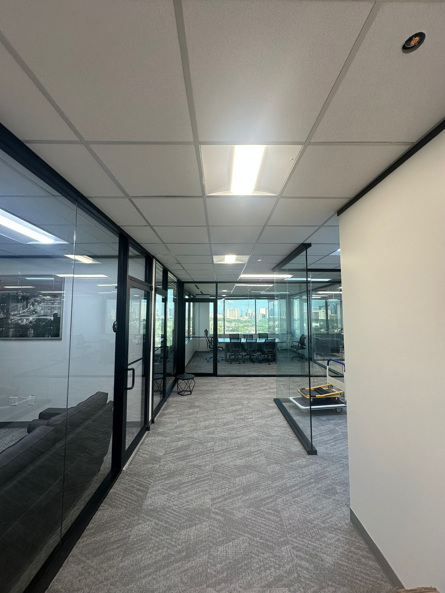 The finished office space is bright, modern, and highly functional. Glass partitions create private spaces while keeping the overall environment open and collaborative. Updated flooring also contributes to a professional look that aligns with the client’s goals. The project was delivered on time and is ready for occupancy.